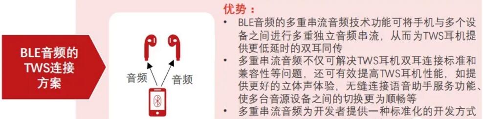 BLEA標準采用多重串流音頻技術,可實現無線多路直聯,單一音頻輸出設備與一個或多個音頻接收設備之間,可同步進行多重且獨立的音頻串流傳輸。BLEA標準的頒布打破蘋果TWS專利封鎖,解決TWS耳機雙耳直連的標準問題和兼容性問題,為安卓TWS廠商提供標準化的TWS耳機開發方式,有助于釋放安卓TWS廠商的生產力。
