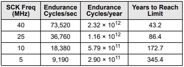 FeRAM存儲(chǔ)器具有讀取和還原機(jī)制。因此,對(duì)于存儲(chǔ)陣列的每次訪(fǎng)問(wèn)(讀取或?qū)懭耄瑢葱惺┘幽途弥芷凇?FRAM體系結(jié)構(gòu)基于每個(gè)64位的16K行的行和列的陣列。整個(gè)行在內(nèi)部訪(fǎng)問(wèn)一次,無(wú)論是讀取還是寫(xiě)入一個(gè)字節(jié)或全部八個(gè)字節(jié)。在耐久性計(jì)算中,該行中的每個(gè)字節(jié)僅被計(jì)數(shù)一次。下圖顯示了一個(gè)64字節(jié)重復(fù)循環(huán)的耐久性計(jì)算,該循環(huán)包括一個(gè)操作碼,一個(gè)起始地址和一個(gè)順序的64字節(jié)數(shù)據(jù)流。這將導(dǎo)致每個(gè)字節(jié)在整個(gè)循環(huán)中經(jīng)歷一個(gè)持久周期。即使在40 MHz時(shí)鐘速率下,F(xiàn)RAM的讀寫(xiě)持久性實(shí)際上也是無(wú)限的。