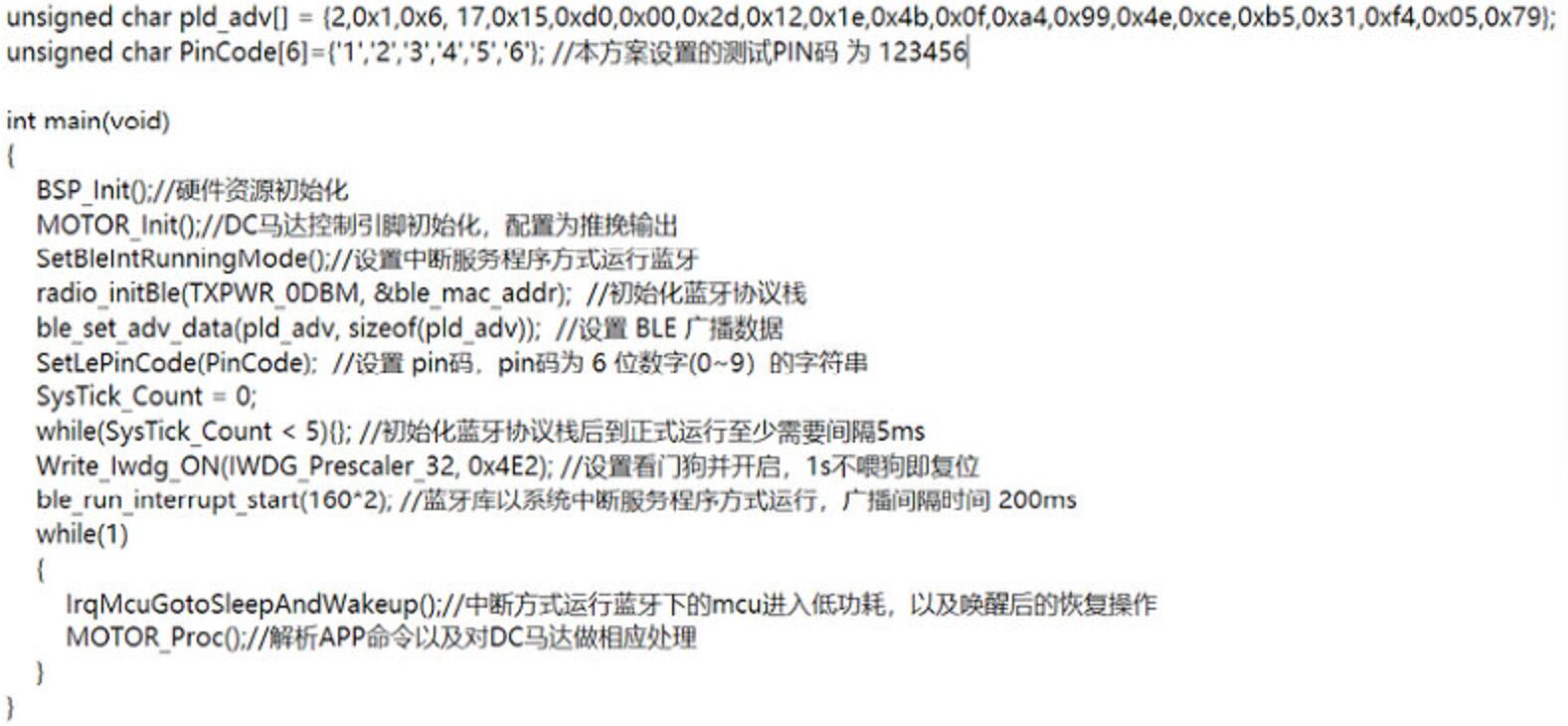以下為主函數(shù)初始化配置內(nèi)容,主要將所有的外設(shè)資源和藍牙協(xié)議棧初始化,并且以中斷服務(wù)程序的方式運行藍牙,主函數(shù)的循環(huán)中主要實現(xiàn)的功能為判斷是否進入低功耗模式,并且喚醒后根據(jù)接收到的藍牙數(shù)據(jù)對DC馬達進行不同的操作,代碼如下:
