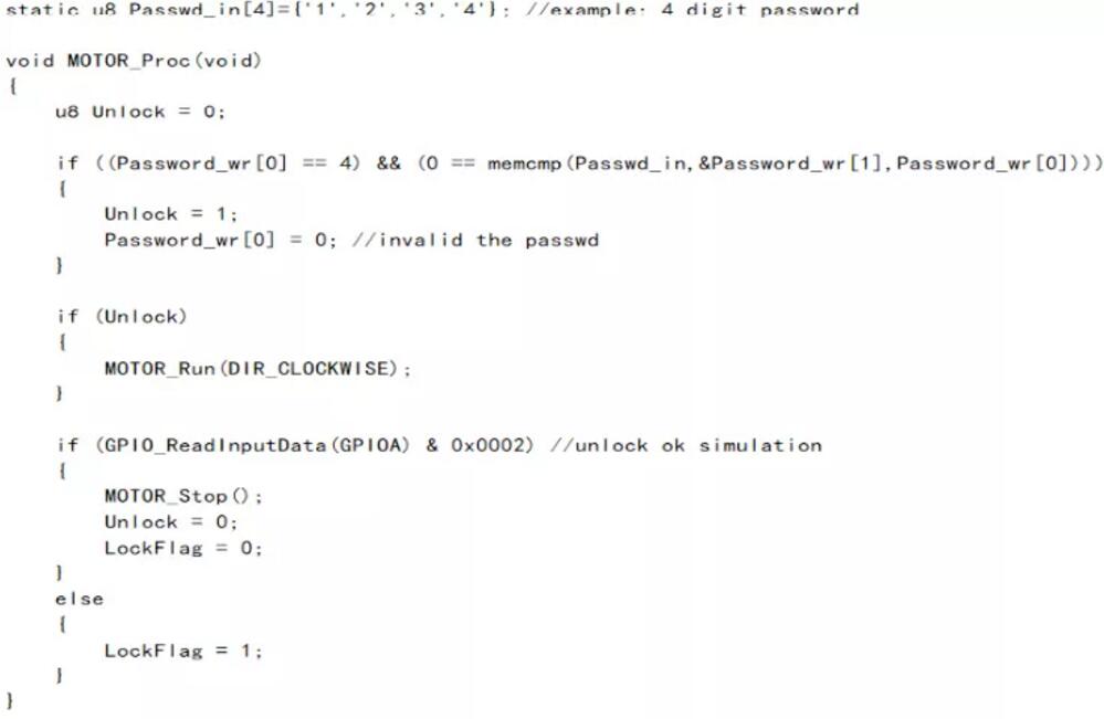 在MOTOR_Proc()處理函數(shù)中針對藍牙接收到的密碼數(shù)據(jù)進行解析,如果與默認設(shè)置的4位0-9數(shù)字密碼完全匹配上則操作解鎖,將DC馬達按照設(shè)定方向控制運轉(zhuǎn),為了簡易驗證,模擬一個信號表示解鎖成功,這里是通過采集指定IO引腳PA1的輸入來實現(xiàn),采集到輸入為高電平那么停止DC馬達轉(zhuǎn)動,且清零鎖定標志位。以下為代碼實現(xiàn)內(nèi)容: