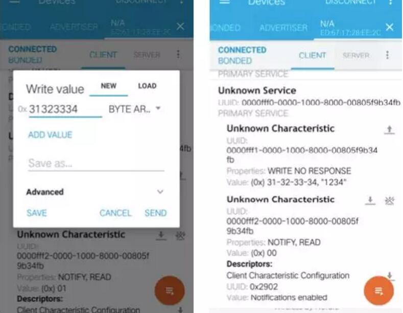 連接成功后,對UUID為fff1的特征值寫0x31323334(模擬用戶輸入密碼”1234”),測試板上連接的馬達開始轉(zhuǎn)動,執(zhí)行開鎖動作;