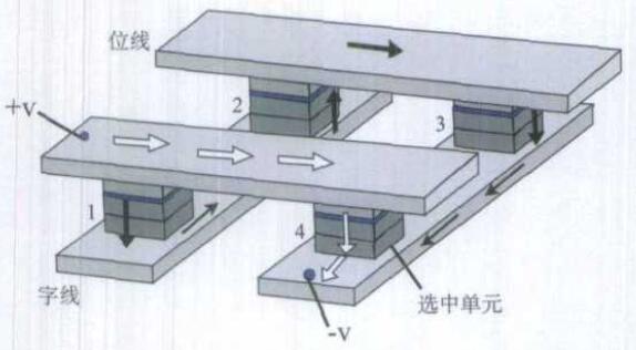 圖4給出由4個(gè)MRAM單元組成的刪格,在一條位線和一條字線加上電壓后,由圖可見被選中的是4號MRAM單元,這時(shí)電流從‘+V’電極流至‘-V’電極可以有兩條通道。