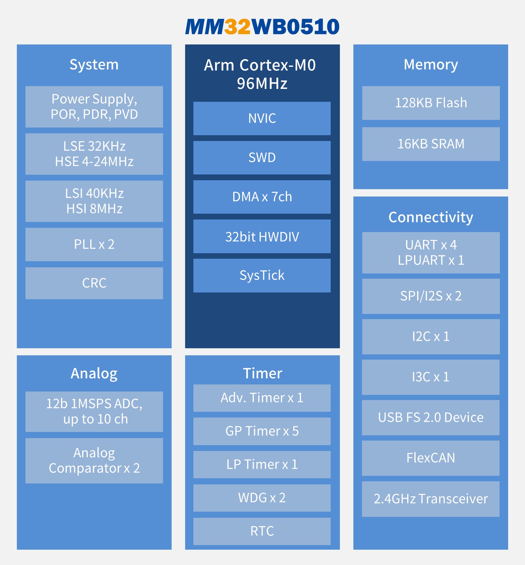 MM32WB0510搭載Arm Cortex-M0內核,主頻可達96MHz,內置128KB Flash和16KB SRAM,并集成了USB和FlexCAN接口,面向智能家居,鍵鼠,消防現場部件,電力電子,汽車OBU,汽車傳感器等無線和多接口類型的應用。可選封裝形式包括:LQFP64,LQFP48,QFN48和QFN32。