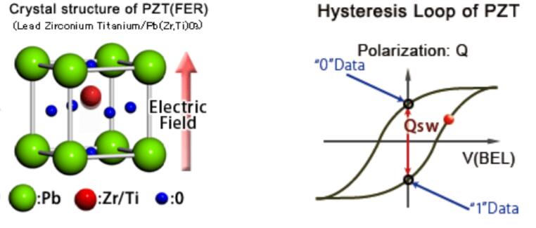 FRAM或鐵電隨機存取存儲器使用1個晶體管–1個鐵電電容器(1T-1FC)架構,該架構采用鐵電材料作為存儲設備。這些材料的固有電偶極子在外部電場的作用下轉換為相反極性。改變鐵電極化態需要偶極子(位于氧八面體中的Ti4+離子)移動(在Pb(Zr,Ti)O3的情況下)對電場的響應(圖4)。自由電荷或其他隨時間和溫度累積的離子缺陷會阻止這種運動,這些缺陷會導致偶極子隨時間松弛,從而導致疲勞。